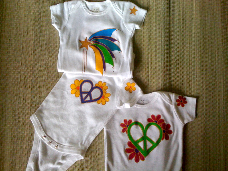 Now I want to make these available to you. Each onesie on my Etsy shop page is individually, hand painted by me. No stamps, no tracing or stencils used, all done by freehand. Each one has a strong, bright design on the front, 1 or 2 small designs on the sleeves and another small design on the back, upper right side that we call "the tatoo". I pre-wash the items first, paint and then heat set making them durable for washing in warm water and throwing into the drier...